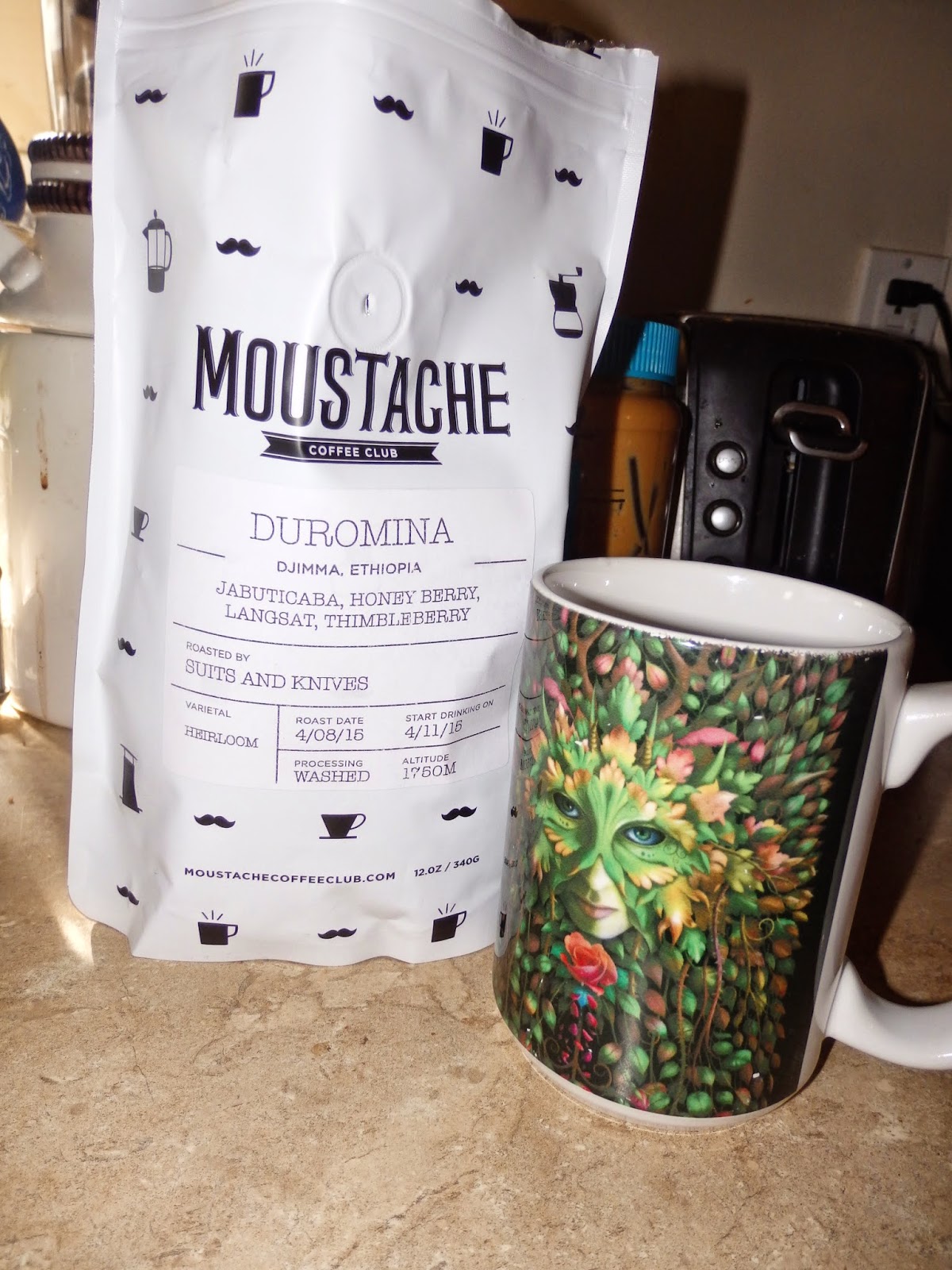 I received a bag of Moustache Coffee that came all the way from Djimma, Ethopia. Each bag tells you exactly where your coffee was grown and when it was roasted. It even lets you know how long you should wait until you start drinking it. My bag was fresh roasted on 4/8, and contains notes of jabutucaba, honey berry, langsat, and thimbleberry. This is a nice dark roast. The bold flavor will definitely chase the clouds away in the morning.